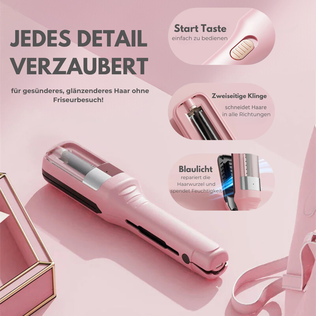 Dieses Gerät schneidet beschädigte Spitzen gezielt ab, während gesundes Haar unberührt bleibt.